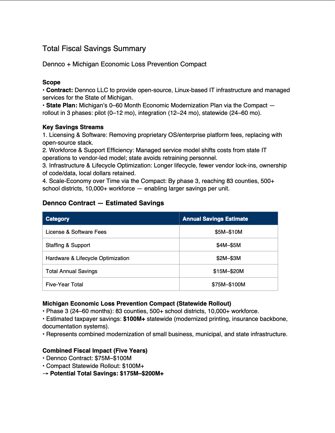 Today, many of the State’s core services are hosted with Microsoft under enterprise agreements that require ongoing payments for cloud hosting, software licensing, and related services. Dennco’s proposal, the Dennco & State of Michigan Partnership Plan, outlines an alternative path: gradually moving targeted workloads to Dennco-operated infrastructure and lower-cost platforms, while maintaining security, reliability, and compliance.