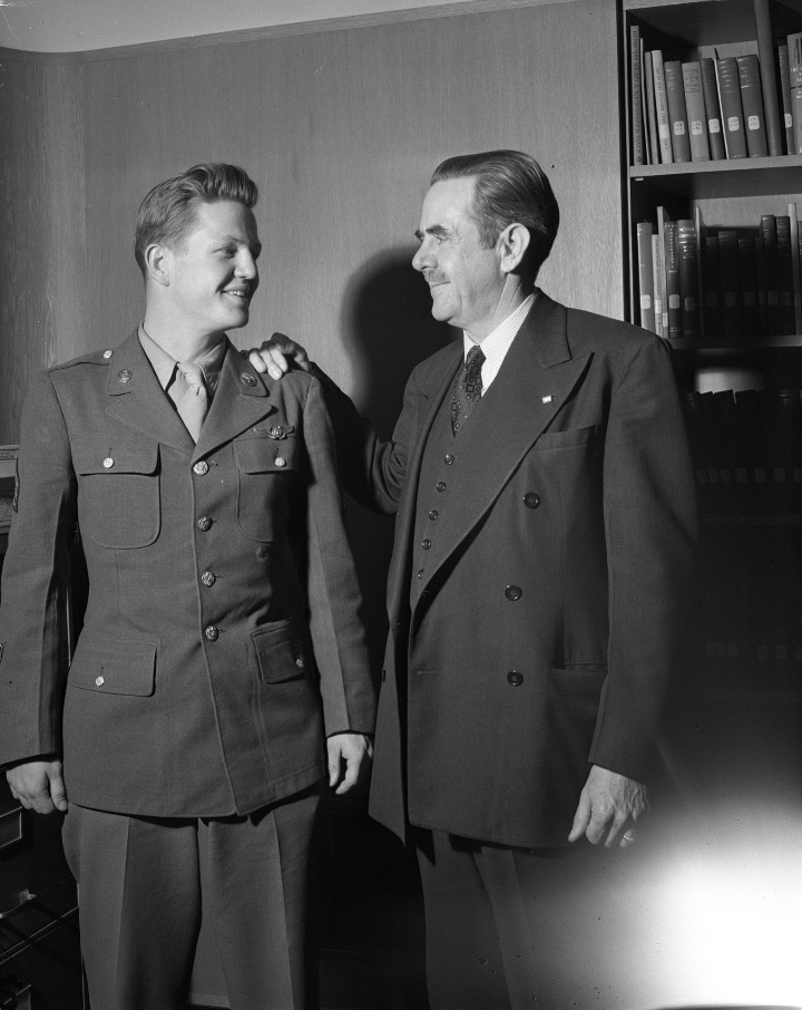 Photograph of Richard Arthur Maddy (left) in U.S. Army Air Forces uniform with his father, Dr. Joseph Edgar Maddy (right), founder of Interlochen Center for the Arts. c. 1944.